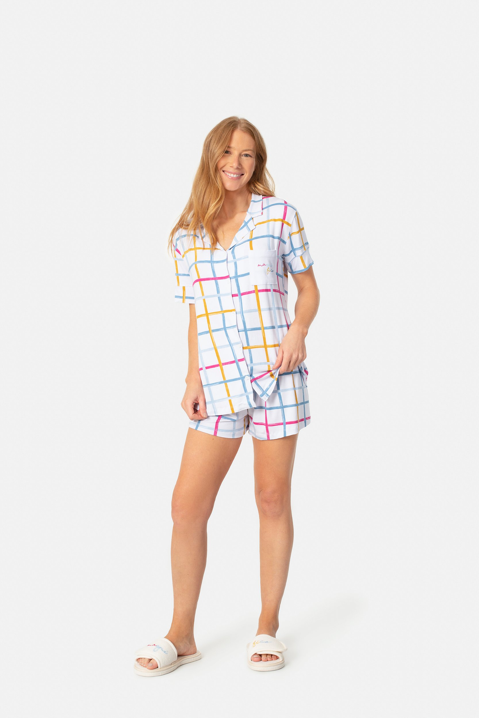 Pijama camisaria manga curta com estampa quadriculada utilizando técnica em aquarela com aspecto de pinceladas, elas formam listras autênticas e cheias de personalidade.