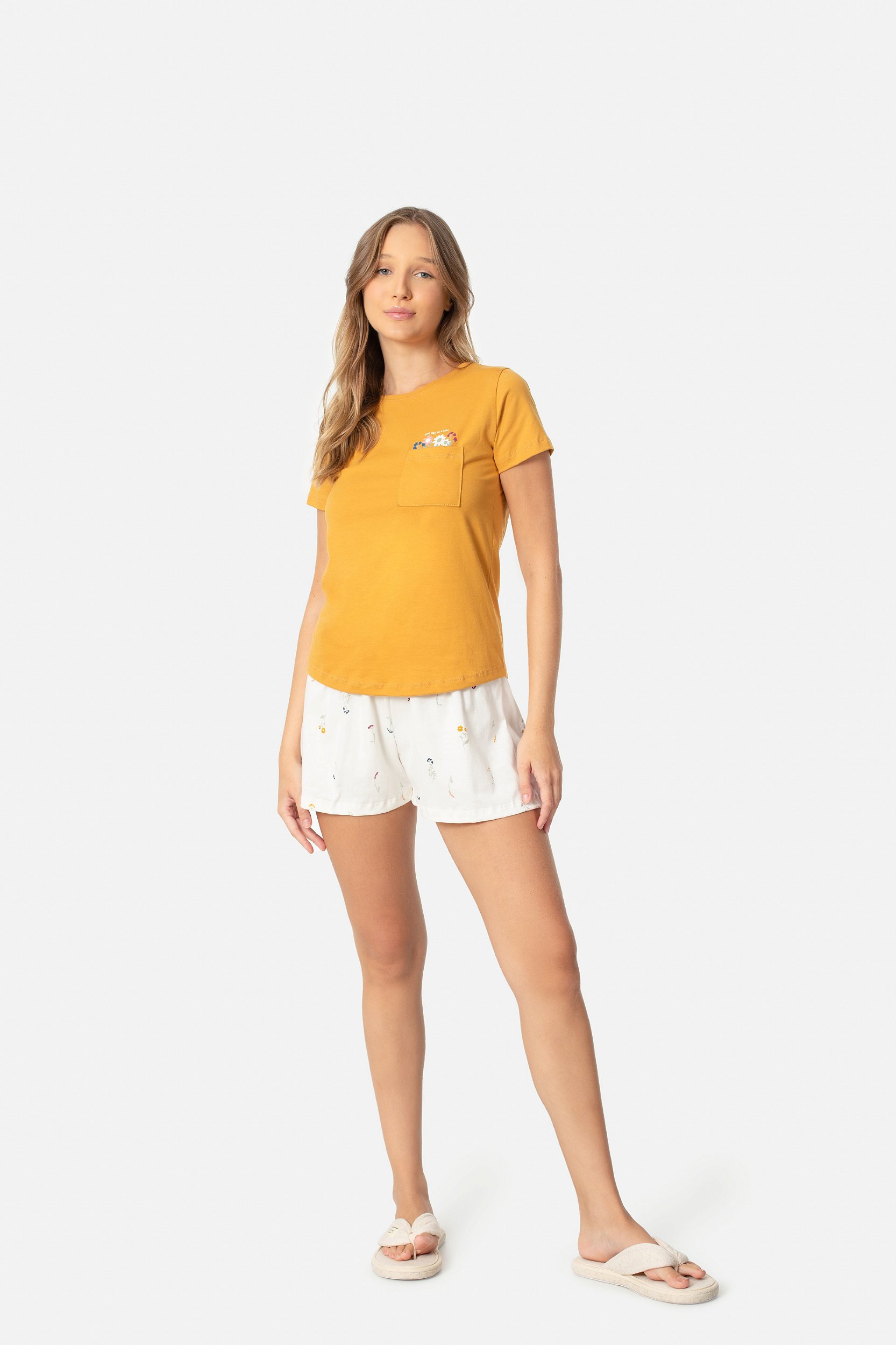 Pijama coom short e camiseta na estampa de flores do campo, design que promove uma sensação de tranquilidade e delicadeza.